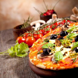In addition to pizzas, the restaurant offers a variety of snacks like fries and poutines, chicken dishes including wings served with BBQ sauce, pasta options like all-dressed lasagna and gratiné spaghetti, and sandwiches such as the Doner Sandwich and Chicken Pitas.